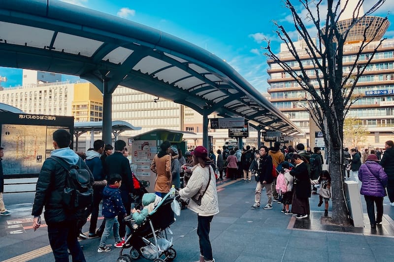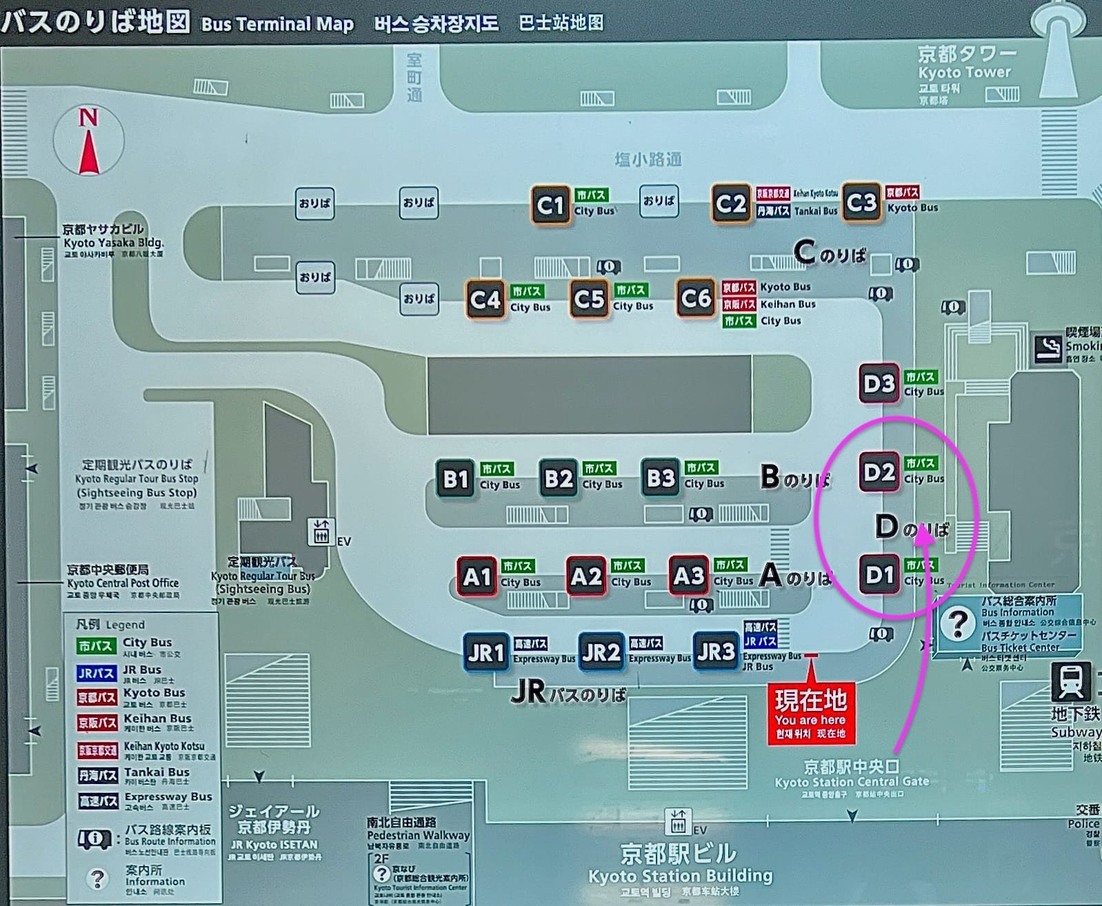 多くの観光客は市営バスに当たり前のように乗車するので、京都駅中央口から鼻毛のごとく飛び出してきたら、そのまま上記「D1」や「D2」のりばへ向かい、そして並ぶ♡
