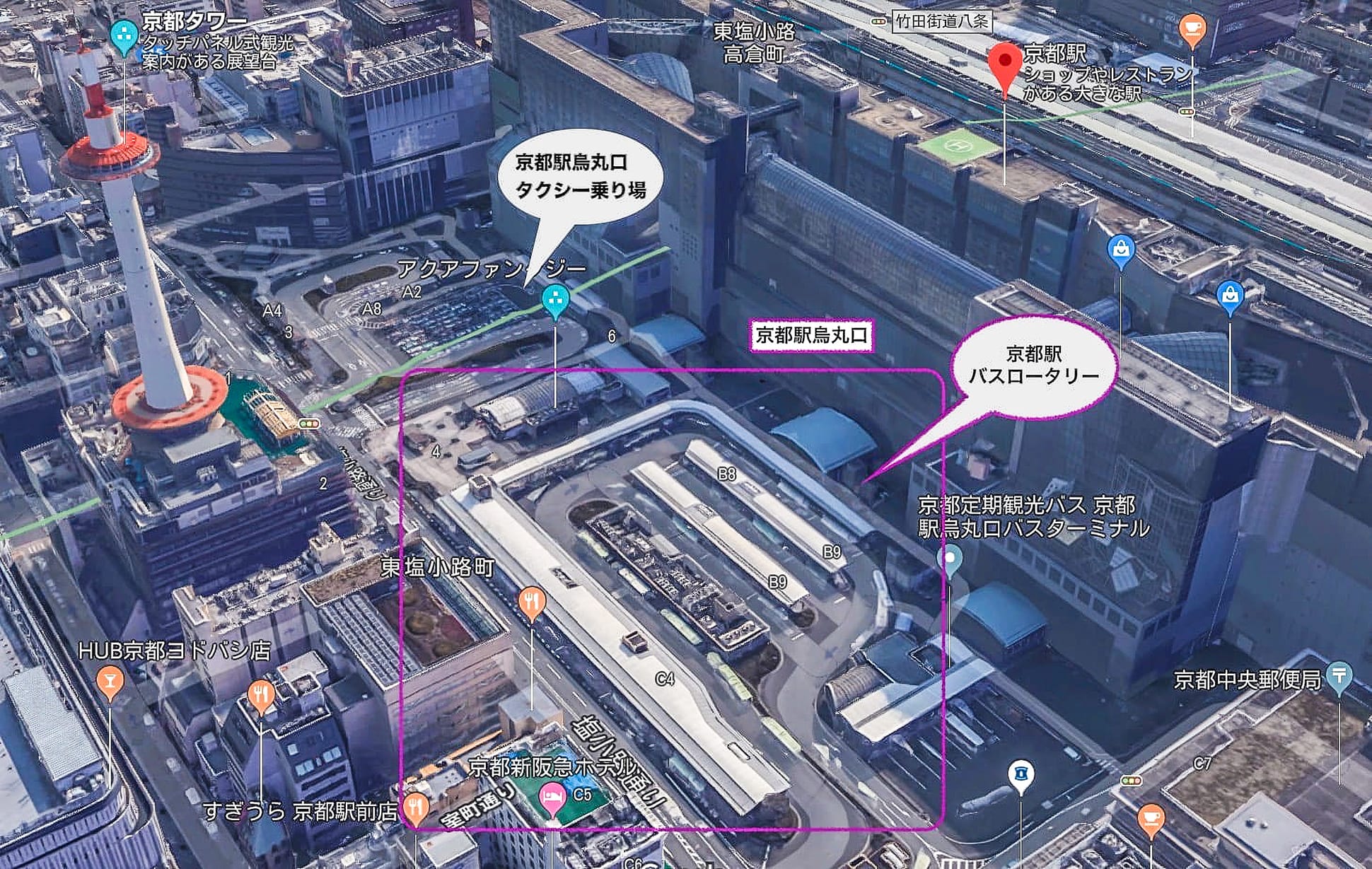 上記、D1&D2バス停を通り過ぎて京都タワーの方へ歩く。京都タワーの斜向かい。ロータリーの最奥(北側)に位置する。