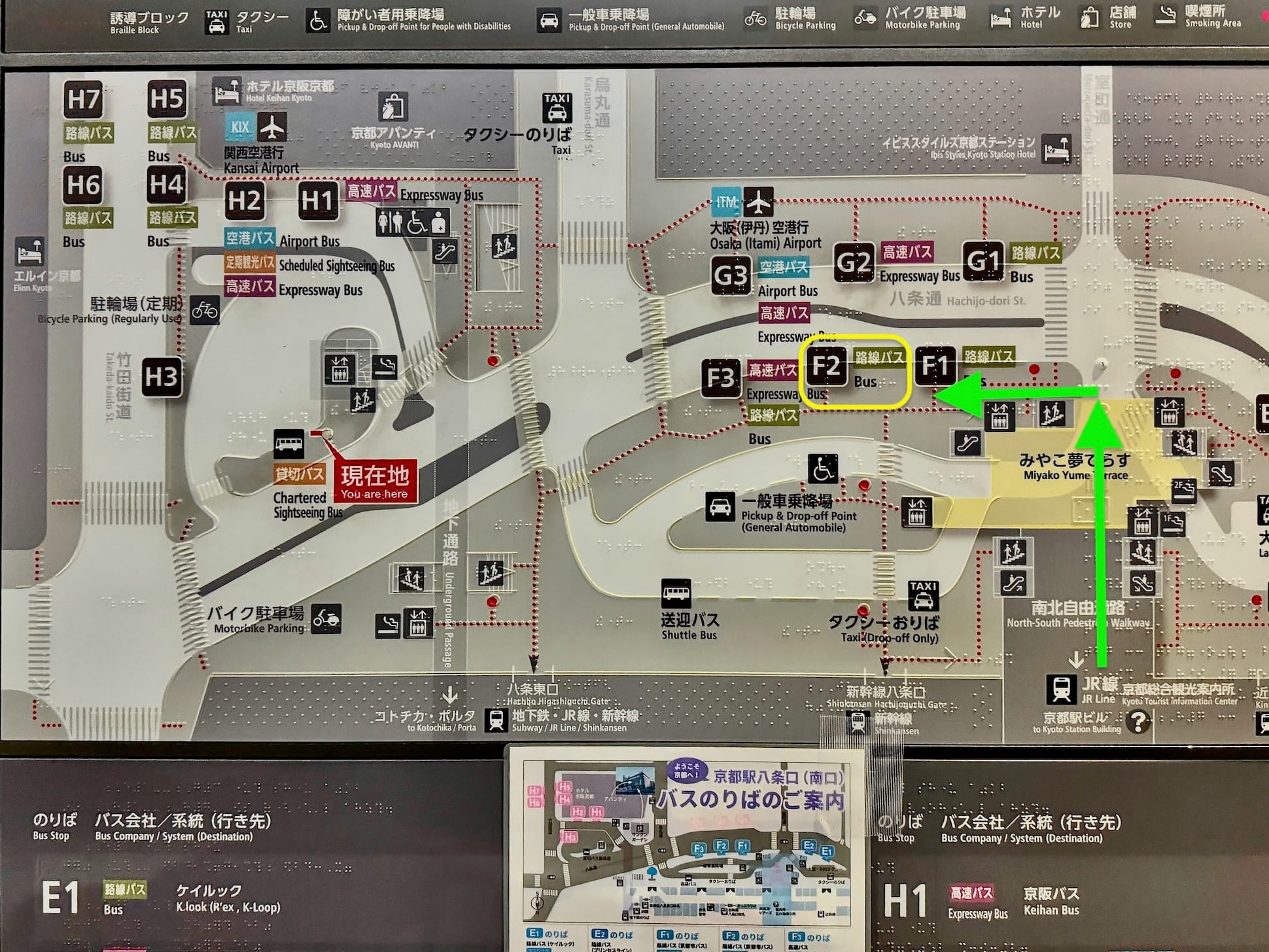 京都駅八条口から清水寺(五条坂・清水道)方面へ行くバス乗り場は「F2」乗り場になる。
