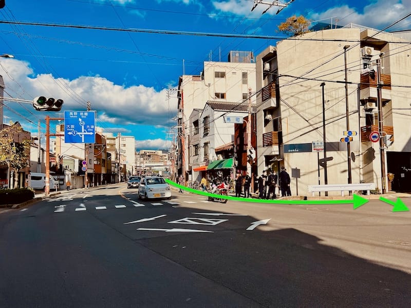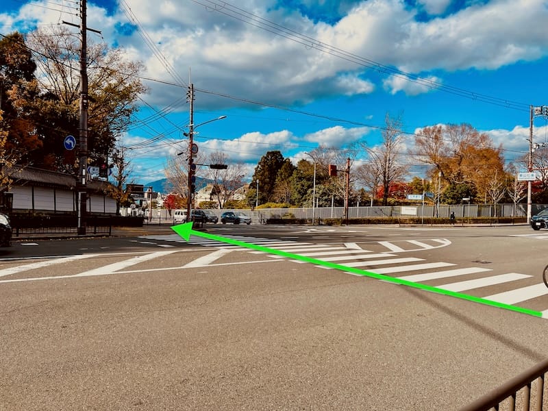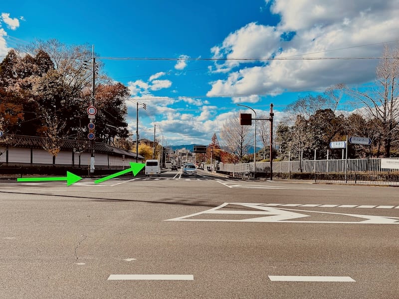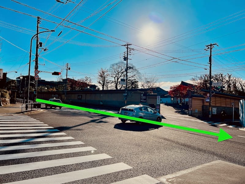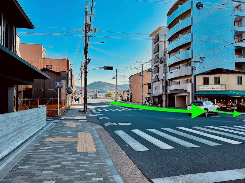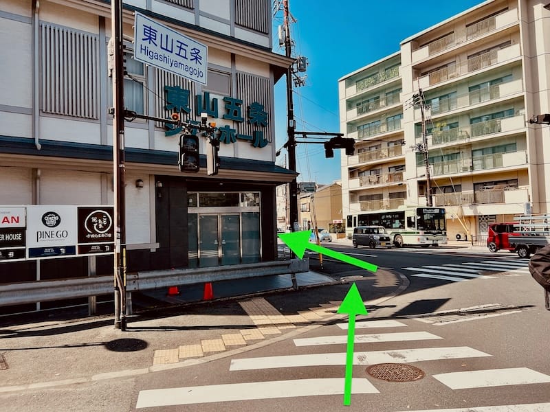 五条坂を直進する形で下り、東山五条交差点に到着したら、大谷本廟前に見える横断歩道を渡り、国道1号を横断す〜る。