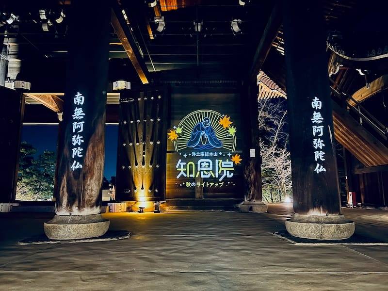 柱に「南無阿弥陀仏」、門内壁には法然上人の御影に加え、「浄土宗 総本山 知恩院 〜秋のライトアップ〜」と超絶素敵に描かれたプロジェクションロゴライトの演出が‥あっちゃぅ。